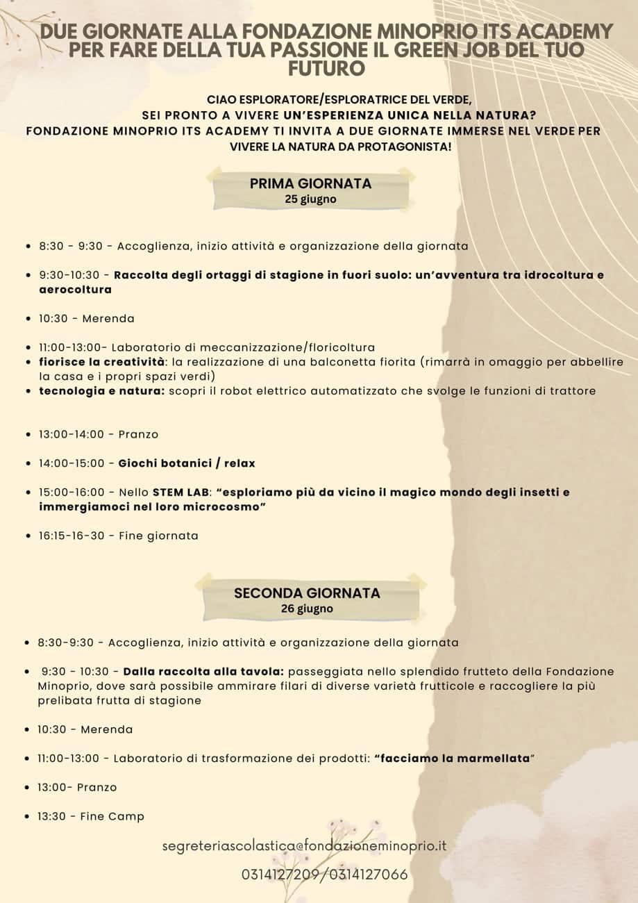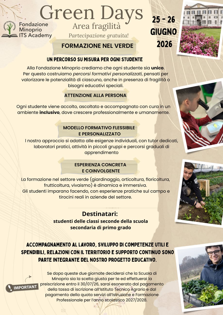Green Days 2026 Dedicato agli studenti di seconda media Con una data riservata all'area fragilità 1. Seleziona le date 1-2 luglioPosti disponibili: 58-9 luglioPosti disponibili: 1315-16 luglioPosti disponibili: 16Riservato area fragilità - 25-26 giugnoPosti disponibili: 20 2. Inserisci i tuoi dati Nome * Cognome * Email * Telefono * Anno di nascita * Provincia di provenienza * Seleziona...AgrigentoAlessandriaAnconaAostaArezzoAscoli PicenoAstiAvellinoBariBarletta-Andria-TraniBellunoBeneventoBergamoBiellaBolognaBolzanoBresciaBrindisiCagliariCaltanissettaCampobassoCarbonia-IglesiasCasertaCataniaCatanzaroChietiComoCosenzaCremonaCrotoneCuneoEnnaFermoFerraraFirenzeFoggiaForlì-CesenaFrosinoneGenovaGoriziaGrossetoImperiaIserniaLa SpeziaL'AquilaLatinaLecceLeccoLivornoLodiLuccaMacerataMantovaMassa-CarraraMateraMessinaMilanoModenaMonza e della BrianzaNapoliNovaraNuoroOlbia-TempioOristanoPadovaPalermoParmaPaviaPerugiaPesaro e UrbinoPescaraPiacenzaPisaPistoiaPordenonePotenzaPratoRagusaRavennaReggio CalabriaReggio EmiliaRietiRiminiRomaRovigoSalernoSassariSavonaSienaSiracusaSondrioTarantoTeramoTerniTorinoTrapaniTrentoTrevisoTriesteUdineVareseVeneziaVerbano-Cusio-OssolaVercelliVeronaVibo ValentiaVicenzaViterbo Classe attualmente frequentata *Seleziona...Prima mediaSeconda mediaTerza mediaPrima superioreAltro Istituto (nome e comune) * Da chi verrai accompagnato? Indicare eventuale certificazione/BESNessunaDiagnosi funzionaleDSAADHDCollegio ASL 3. Consensi * Consenso al trattamento Consenso ricontatto per materiale informativo Consenso utilizzo dati per usi interni (appuntamento) Accettando i termini dichiaro di aver letto e compreso l'informativa sulla privacy. Invia Prenotazione